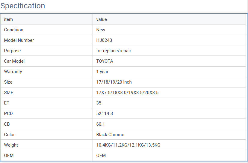 Size :17X7.5/18X8.0/19X8.5/20X8.5