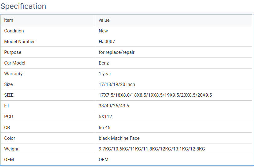 Size :17X7.5/18X8.0/18X8.5/19X8.5/19X9.5/20X8.5/20X9.5