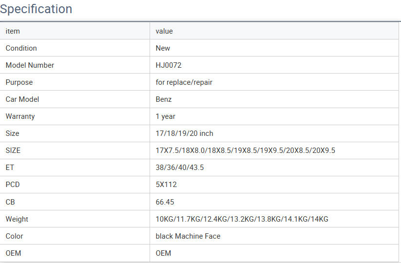 Size :17X7.5/18X8.0/18X8.5/19X8.5/19X9.5/20X8.5/20X9.5